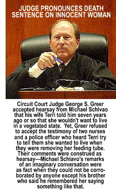 capable of experiencing emotion...and pain. I was not at all surprised that Judge Greer was expelled from his church. Nor was I surprised that Greer was flooded with a virtual sea of of death threats, angry emails, faxes, phone calls and criticism from constitutional groups, disability rights groups, pro-life groupsand even Jesse Jackson. (Well, actually Jesse Jackson's showing up did surprise me although with all of the news cameras at Woodside, Jackson, or someone like him, was bound to show up for the photo op.) The real tragedy of the Terri Schiavo story is that the daughter of Bob and Mary Schindler was not a terminally ill patient. She was not "brain dead." Granted, she was never going to walk out of Woodside Hospice regardless how much physical therapy she received. Terri Schiavo was a bulimic oxygen-deprived woman who suffered severe brain damage after a fall in her home. Her crimethe crime for which she was sentenced to deathwas that she was so severely infirm and so mentally incapacitated that she would never again be a functional member of society. Nevertheless, according to at least one medical doctor who examined her, with rehabilitation and speech therapy, Terri Schiavo could have become a communicative, functional member of the Schindler family. But that would have posed a serious dilemma for Michael Schiavo who had moved on with his life and replaced her with a common law wife and two children born from that union. Terri Schiavo was just so much extra baggage that no longer fit in the world he created. Tragically, as the end drew