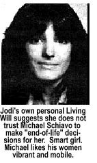 advocates argue, justifies euthanasia. While euthanasia may rightly be construed as an act of mercy for a handful of people in a handful of instances nationwide, the American people need to very carefully consider what they wish for when they demand the passage of "right-to-die" legislation since the Living Will does not give those signing them more control over their fate. It provides legal cover for its beneficiarythe medical care facilitywho has been given the power to take your life. The Living Will does not promote well-beingexcept perhaps for the "well-being" of the coffers of the government. Medicare, which foots the bill for medical care for the aged, is facing the same types of shortfalls as Social Securitya rapidly shrinking tax base as more and more members of grey America becomes eligible for benefits. The question lurking in the back of the mind of government is: at what point can Uncle Sam no longer afford to care for chronically ill patients? At what point does voluntary euthanasia, requested through a Living Will, become mandatory euthanasia? If we accept the logic that it is morally defensible to demand that we be allowed to die to alleviate our own needless suffering from a chronic or terminal illness or injury that will ultimately result in our dying, then how can we reject the notion that government is not morally justified in establishing a mandatory criteria for doctors to follow in cases where patients are construed to be terminal? Or, where elderly patients are admitted with chronic medical problems that simply drain the system without any hope of the patient's health improving? The moral argument is a two-headed dragon. You can't argue for the right of people to be allowed to end their own lives by rejecting extraneous measures to keep them alive and, in the same breath, reject the right of government to arbitrarily decide to end lives judged to be not worth living, or which are too much of a drain on the healthcare system to pay for the care needed to assure your survival.. That is the dilemma facing America. That is why America became so divided watching the life or death struggle of Terri Schindler-Schiavo. Looming heavily in the minds of those who believed custodial rights for Terri Schiavo should have been granted to her parents was the frightening question of how a local Pinellas County judge could presume to sentence to death an innocent woman on a hearsay statement from her estranged husband who wanted her dead so he could marry his common law wife.