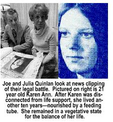 any At around 2 a.m. on April 15, 1975 Quinlan's adoptive parents, Joe and Julia Quinlan received a call from Newton Memorial Hospital that their 21-year old daughter, Karen Ann was brought in. She was in a coma from a night of drinking vodkaafter taking Valium. When doctors determined Karen Ann's condition was irreversible, she was transferred to St. Clare's Hospital in Denville nine days later. After consulting with their parish priest the Quinlan's decided Karen Ann would never want to be kept alive by artificial means. Her parents signed a consent form authorizing the hospital to remove Karen Ann from her respirator. Ultimately the hospital refused their request and Quinlan v St. Clare's Hospital became the most watched right-to-die case in the nation until the Schiavo case. While he lost in Superior Court, Joe Quinlan successfully argued to the New Jersey Supreme Court that his adopted daughter would not want to live as a vegetable and should be allowed to die with dignity.