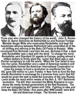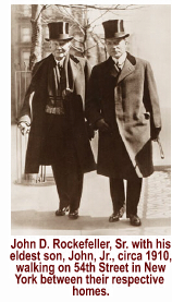 for five years. White broke Standard Oil into seven separate entities. Rockefeller was not ordered by the court to divest himself or his shareholders of any of the new properties. Where John D. Rockefeller owned one mega oil company on May 14, 1911, he owned six giant oil companies and one large petrochemical company on May 15, 1911. Overnight, Rockefeller's wealth multiplied seven times over. US Senator Robert LaFollette [R-WI] was among the Congressmen and Senators in the Supreme Court building on May 15 to hear the court's decision over the fate of Standard Oil. LaFollette shook his head as the decision was read. "I fear that the court has done what the [Standard Oil Trust] wanted it to do and what Congress has refused to do," he later told reporters. White was the author of the "rule of reason" doctrine with respect to the Sherman Antitrust Act. The Sherman Antitrust Act was specifically legislated to break Standard Oil apart. Up until that time, the law had never been applied against any other company. (During World War I, the Sherman Antitrust Act would be applied against several unions under the umbrella of both the AFL and the CIO.) The "rule of reason" doctrine was a principle by which the courts would outlaw only those restraints of trade that violated the public interest. The spin-offs were initially called the Rockefeller stepchildren, but as they found their place in the market, they became known collectively as the Seven Sisters. The primary entitythe flagship stepchildStandard Oil of New Jersey, ultimately became Esso, and then Exxon. Today, after a myriad of splits and mergers, Exxon-Mobil (figuratively it remains corporate Standard Oil using a moniker), Chevron-Texaco (now officially Chevron), and BP-Amoco are the dominant oil players not only in the United States but around the world. And along with Royal Dutch Shell (the Rothschild- Nobel-Samuels oil dynasty in Europe), these companies today pretty much control the price of gasoline, fuel oil, natural gas, diesel fuel and kerosene around the globe. They are the price fixersand the price gougers. And, they are completely invisible. When they gouge the public, either the oil jobbers, the station owners or the Arabs get the blame. With the advent of the automobile at the turn of the 20th century, oil stocks skyrocketed. But the stock of the Seven Sisters, which had been depressed for most of the 5 years that Standard Oil was in court, simply exploded. Standard Oil of New Jersey inherited Standard Oil's vast refinery system, but no oil reserves to supply them, forcing that entity into a close collaboration with its siblings. Atlantic Refining Company (ARCO) would hit the charts in the 1970s for creating a line of graphite-based motor oils. It would be absorbed by BP-Amoco. Standard Oil of New York became Mobil. Standard Oil of Indiana became Amoco (which would ultimately be purchased by British Petroleum [BP]. Standard Oil of California became known as Chevron. Atlantic Refining split, becoming both Atlantic Richfield and Sun Oil, or Sunoco. Continental Oil, another California Standard Oil subsidiary, became Conoco. Conoco would buy Phillips, becoming Conoco-Phillips. Chesebrough-Ponds, a petro-cosmetic company that used petroleum products, was the 7th spawn of an evil father. While Chesebrough and Ponds created a myriad of creams, salves, benzine, and paraffin products for canning and candle-making, probably its best known product today remains Vaseline Petroleum Jelly. Also part of the Seven Sisters are British Petroleum [BP] and Standard Oil of Ohio, or its acronym, SOHIO. All totaled, with the divestitures of entities within the Seven Sisters, there were ten stepchildren although, slowly, they are morphing back into a single supra entity. Whether that supra entity will wear the name Standard Oil or Exxon-Mobil remains to be seen. Since the name Standard Oil still carries a 150 year old stigma it is likely that the Rockefeller clan will allow the name Standard Oil to slip quietly into history like an embarrasing old relative. The HistoryJohn D. Rockefeller, Sr. was an enigma in the oil industry. Without a doubt he was recognized as the most ruthless businessman in the world. Yet he was a devout, and very pious, charitable churchgoing Christian for his entire life. On the other side of the Atlantic Ocean was the most respected and trusted businessmen in EuropeBaron Alphonse de Rothschild. The deepening clash between the oil titan Rockefeller and the banker, Rothschild would ultimately bring about the collapse of a nation, the prolongation of World War Ieven after Germany and Austria had surrenderedand the interjection of the most oppressive political system ever devised by man over half of the world. By the end of the 19th century, oil would become the most valuable commodity in the world. Those who owned the portals from which it was pumped from the ground virtually controlled the Earth and all of its inhabitants.