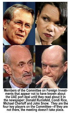 deal without the approval of any of their higher ups. When the port deal was first revealed by the media, Homeland Security Director Michael Chertoffwhose fingerprintslike Treasury Secretary John Snow and Secretary of State Condoleeza Ricewere all over it, first said that the Commission on Foreign Investments thoroughly vetted the deal. Then the Homeland Security czar said he was unaware that a Dubai-owned company was seeking control of the British company Peninsular & Oriental until after the deal was approved. Snow, who heads the Commission and is the final authority outside of the White House on whether deals pass muster, pretty much claimed the same thing. So, initially, did Defense Secretary Donald Rumsfeld. However Snow, who was the former CEO of CSX was leading that company when America's rail giant was purchased by Dubai Ports World. Since he had a relationship of trust with Crown Prince Shaikh Mohammad, Snow was the honest broker Rice needed to talkone-on-onewith the Crown Prince. In the modern Muslim world, the anti-female emirs will grudgingly sign a treaty brokered by a female American Secretary of State only because the treaty must be signed by a male president and ratified by a male-dominated US Senate before it becomes official. However, in the shady Muslim world of backroom deals that always take place in isolated areas in the cool desert night where nothing is ever written down and a man's word is his bond, an emir will not make bond by shaking hands with a woman sincein the Muslim worlda woman's word has no bond because a woman is still an inferior citizen whose word is not legally binding on a man. Snow and Rumsfeld were the backroom brokers Rice needed to close Bush's deal with the UAE. Rice told the media she believes the deal "...serves the interests of the United States." It does only if the president says it does. The Commission on Foreign Investments does not make decisionsit makes recommendations to the President. And, it is the President of the United States who makes the final decision. For that reason its hard to believe that President Bush was not aware that the transfer of the management of the operations at six major US ports from a privately-owned British company to a UAE state-owned company was about to take place. And based on the anti-Muslim sentiment of the American people since Sept., 2001, Bush's advisors should have been able to predict the potential firestorm and political backlash that was going to result when the deal for an Arab company to take over the stevedore activities at the shipping terminals of the ports of Baltimore, Miami, New Jersey, New Orleans, New York, and Philadelphia became public. Tragically, they didn't. Now they are forced to deal with backlash from our allies in the Muslim world. And, while the Republicans are now moving closer to Bush's position, the Democrats are drifting farther awaycloser to the majority of the American people who see no sense in this deal. Bush may be losing his core appeal to his constituents. He doesn't get it. It's not about the economy, its about security, stupid. I guess Forrest Gump was right: stupid is as stupid does. The White House position that the President first learned that his agency heads approved the Dubai-owned company's bid to purchase the privately owned Peninsular & Oriental Steam Navigation Company without his knowledge or consent, from newspaper reports, is actually more frightening that the contemplation that the Bush Administration misjudged where his constituents stood on this issue. Or that Bushin making a deal with the devilinadvertently not only provided terrorists with the means to surreptitiously enter the country, but that he also gave them the means to get a suitcase nuke (which is actually about the size of three standard footlockers) or a dirty bomb into the country without being detected. White House spokesman Scott McClellan distanced the president by stating the decision to approve the ports deal was made by the 12-member Committee on Foreign Investments because none of the president's agency heads raised concerns about the Dubai deal. Yes, stupid is as stupid does. You can't shoot the messenger if he refuses to deliver the message. It appears that the major blunder made by Bush's senior advisors was that when they were trying to calculate the consequences of this deal, they appear to have used the ramifications of Clinton's handover of the Port of Long Beach to the People's Republic of China as the yardstick by which they measured the potential falloutand wrongly concluded that the Dubai deal would be met with only token "election year" resistance that would quickly evaporate since the UAE was now a fully-vested partner in the war on terrorism. Where is Karl Rove when you need him? Or did Rove miss this one? Ibrahim Hooper, spokesman for the Council on American-Islamic Relations [CAIR] is convinced that the furor is the result of anti-Muslim bias in the United States, and has nothing to do with security. Hooper believes that the American people believe Muslims are less trustworthy than other people. The Arabs are calling it Islamophobia. The liberals who believe there is such a thing as homophobia will buy the spiel, but those who know Christians don't "fear" homosexuals (they simply abhor the unnatural practice) will know it's wisdom, not fear, to mistrust the martyrdom-inclined Islamist who dines with you tonight and dies with you tomorrow. "The American people," Hooper said, "are saying 'Don't sell our ports to the Arabs.' Well, that's not what's happening at all. The government is still screening the cargo, the Coast Guard is still protecting the port, the union longshoremen are still loading and unloading the cargo. I believe the majority of the employees of the company are British and American. The COO is American." Today. But once the deal is done and ownership of Peninsular & Oriental changes hands, internally, the companyand its key officers in the United 