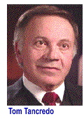 him. Tancredo has the Reagan magic. Today, 52% of the American people want our borders sealed and the illegals deported. Tancredo is the only member of Congress seeking the nomination who will do more give lip service to the issue. If the presidential elections were held today, and if Tancredo was the GOP nominee, regardless who he ran against in a two-party race, he would win. In 1975, when the National Association for Bilingual Education [NABE] was funded as an advocacy group to help implement Title VII of the Elementary & Secondary Education Act, more commonly known as The Bilingual Education Act of 1968 at the State level, Tom Tancredo was a Jr. High School social studies teacher in Denver. Colorado had just enacted the nation's first mandatory bilingual education law. Tancredo watched as Hispanic students were pulled from his English-speaking class and transferred to Spanish-only classes. The law made no sense to Tancredo who was the grandson of Italian immigrants. To be assimilated into any society, those wishing to become citizens must be able to communicate with the natives. If they can't, its impossible to be assimilated, and they simply become members of a lower class subculture within that society. Tancredo believed the image he had of America as a beacon in the night, drawing people from all over the world and uniting them under one flag and one language would be threatened if America adapted to the immigrants rather than the other way around. In 1976 Tancredo ran for State office in Colorado to try to undo the damage being done by the globalist carpetbaggers in the National Association for Bilingual Education. In 1998 Tancredo campaigned on immigration control and was elected by 55% of the voters in the 6th Congressional District of Colorado to stem the tide of illegals into the Southwest and to repair an education system that would create a Hispanic subculture to deliberately breed second class citizens. In 2004 60% of the voters in the 6th District sent Tancredo back to Washington.