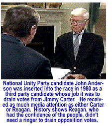Bush was the choice of the transnationalist politicians, bankers and industrialists who, in 1979, were less than a decade away from creating a formal world government headquartered not in the UN complex in New York, but in the former League of Nations headquarters in Brussels, Belgium. Bush, a member of the Council on Foreign Relations and the Trilateral Commission, had the endorsement of the CFR, the Club of Rome, the Bilderbergers, the Rockefeller Foundation, the Carnegie Trust, the Pew Foundation, the Ford Foundation, and most of the international bankers. Bush had been anointed as the man who would lead America through the golden portals to Utopia. Reagan, who was close enough to real power to understand how it worked, knew that David Rockefeller and a handful of powerful bankers and industrialists and their bureaucratic associates on the CFR had learned how to manipulate the electoral process by using third party candidates to drain the votes of the major party nominee they expected to lose. Reagan, who was convinced the CFR and the Rockefeller and Ford Foundations were the driving force behind the movement to create world government. Reagan was determined to make globalism the defining issue in the Presidential Debates with Carter. In fact, wiping out the CFR was to be one of the planks in the Republican platform. He figured if he didn't win in 1980, he was still going to make the election count for somethingand, eliminating the CFR would be the next best thing to winning the White House. Reagan, like most third party candidates today (except those selected by the kingmakers to drain votes from the loser) could not get any meaningful press before he cut a deal with Rockefeller to win the White House. Prior to that, about the only time Gov. Reagan was interviewed was when a reporter wanted to ask him what he thought of Bush's chances against Jimmy Carter. Reagan, the anti-globalist, knew if he won the nomination the globalists would fund the campaigns of several far right third party candidates to drain votes from him so that CFR initiate Carter could win reelection. But the American people flocked to Reagan in such numbers the kingmakers knew they could not keep him out of the White House. Unfortunately, Reagan wasn't as sure of his chances as they were. When the kingmakers offered him a deal, he took it. Reagan made three concessions. First, he agreed to take Bush along as his running mate. Second, he agreed to abandon his crusade against the CFR. And third, he privately agreed to appoint CFR and trilateralists to every key post in his administration. Twenty-eight of the 50 members of Reagan's transition team (the men who would both select, recommend and screen the key presidential appointees of the Reagan Administration) were CFR. Ten others were trilateralists. His transition team recommended, and Reagan appointed, 64 CFR members, 6 trilateralists., and 6 globalists with combined CFR/TC credentials. Three months after his inauguration as the 40th President of the United States, the invisible power behind government decided to "correct the election" and put the man they initially selected into the Oval Office. But Reagan's presidency was Divinely ordained. He miraculously escaped death at the hand of a psychotic, John Hinckley, and went on to become the greatest president of the 20th centuryand one of the three or four best American presidents in the history of the United States. In her book, "My Turn," Nancy Reagan noted that the curtains in Reagan's room at the hospital was nailed shut because the Secret Service was convinced others were involved. Hinckley is still alive only because the conspiracy notion never caught fire. Lee Harvey Oswald died because everyone knew he didn't act alone. In Reagan's