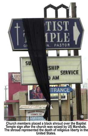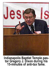 With respect to freedom of religion, what the 1st Amendment was supposed to do was protect was the right of American citizens to worship God in the manner they chosewithout interference from the government. Further, it forbids the government from mandating a State-approved religion. (Far left legal advocacy groups aided by activist judges have violated the 1st Amendment by restricting the religious rights of Christian Americans to the direct benefit of anti-Christian and anti-patriotic groups opposed to Christianity and in favor of world government. Egregious rulings by far left socialist activist judges that actually violate the 1st Amendment while purporting to protect religious freedom added dry kindling to the fires of discontent and placed far right Churches squarely in the center of the controversy.) Indianapolis Baptist Temple pastor Gregory J. Dixonwho once claimed that slavery saved the black race from going to Hellwas greatly influenced by the antigovernment patriot movement that used Christianity as a weapon. Dixon argued that religion should have nothing to do with "the state." After his 16-year battle with the IRS, Dixon grew to believe that the Christian community in the American society was a nation of brethren within a hostile nation and that government was the natural enemy of man. As Dixon's antigovernment sentiments increased, he formed the American Coalition of Unregistered Churches. In 1986, he unincorporated IBT and stopped withholding income tax, FICA, Medicare and both State and federal unemployment taxes from the wages of church employees. From that date forward, IBT deducted no taxes from its employees, paid no applicable Social Security taxes, nor did the church paid unemployment taxes. Scores of small fundamentalist Christian churches followed suit and joined Dixon's organization. This network merged with the structured framework of what became known as the patriot movement. The IRS closes in on IBTIn 1994, the Clinton IRS tried to contact IBT about its failure to file income tax returns since 1987. The IRS constructed income records as best it could from IBT's 501[c]3 history and prepared tax filings for IBT for tax years 1987 to 1993. While IBT renounced its 501[c]3 status, the IRS formally revoked its status as a tax exempt entity on May 8, 1995. Two months later, on July 7, the Indiania Dept. of Revenue did the same thing. The IRS filed tax liens totaling $3.6 million against IBT. Dixon then appears to have replaced ACUC with another unincorporated entity called the Unregistered Baptist Fellowship, thinking, it appears, that in doing so he was somehow sidestepping the Internal Revenue Service. The sum in the federal lien represented not only the withholding taxes (i.e., income tax, Social Security and Medicare) that employers are required by federal law to withhold from the wages of their employees, but also the income taxes owed on the estimated "earnings" of IBTwhich had renounced its own 501[c]3 standing in 1986and accrued interest and penalties on those taxes, real and estimated, between 1987 and 1994. The IRS also filed liens of $31,052.00 against Dixon. In March, 1950 the Indianapolis Baptist Temple was incorporated as a 501[c]3, not-for-profit corporationas most churches are. Five years later, a 23-year old, not quite dry-by-the-ears Rev. Gregory J. Dixon became pastor of IBT. During the next two decades, IBT grew by about 300 members a year, reaching its peak in 1970 when IBT had over 8,000 members and was one of the largest churches in the nation. As radicalism found its way into Dixon's pulpit, his congregation began thinning out. In the mid-1980s. Dixon formed what the media referred to as the "Court of Divine Justice" which openly prayed not only for the death of totalitarian world leaders who opposed Christianity, but public officials in the United States who opposed the militia movement. By the late 1990s, the IBT congregation had dwindled to around 2,500 to 3,000. In 1996, the IRS seized 20 acres of land near the Geist Reservoir, northeast of Indianapolis, that was owned by IBT. In a tax sale, the IRS auctioned it off to Traverse, Inc. for $172 thousand. Proceeds from the sale were applied to IBT's growing tax bill. At that point, it would seem to the logical mind that Dixon would have hired a good tax lawyer to reconcile his differences with the IRS and argue his position before a federal magistrate. Because of the Supreme Court legislated "separation of Church and State." Dixon stubbornly insisted that the government had no authority to tax either his church or its employeesall of whom he described as "ministers"wrongly believing he was somehow exempting them from the obligation of paying taxes since all personal incomeseven those of employees of 501[c]3 organizationsare taxed under US tax code. To most of Dixon's employeeswho were also members of his congregationthis was not a battle they wanted to fight since most of them did not embrace the argument that the income tax was illegalor, at least, they knew as long as there were federal and State laws on the books mandating that people pay those taxes, they were obligated to pay them until such time that the federal and State legislatures repealed those laws. Without exception, all of them filed, and paid, their federal and State taxes each year. Because IBT refused to provide them with W-2 earnings statements, all of them filed as self-employed wage earners. However, the Clinton Administration determined that the taxpayers had improperly filed as self-employed persons when they were actually "employees" of IBT. The IRS declined, or refunded, the taxes paid IBT's employees and sent the tax billwith penalties and interestto Dixon.