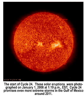 are always the same. The official National Oceanic & Atmospheric Administration [NOAA], NASA and the International Solar Energy Society [ISES] Solar Prediction Panel on Solar Cycle 24 was released on April 25, 2007. Solar activity is normally an 11-year cycle. Solar Cycle 23 began in 1994. About 80 years ago, astro-scientists discovered that the solar eruptions have an east-west orientation that reverse its magnetic polarity with each new cycle, creating what is in reality a 22 year cycle. When a new cycle beginsas it will within a matter of weekssolar activity initially impacts temperatures at high latitudesat either the North or South Pole. At midpoint in the 11 year cycleusually 5 1/2 years (although Solar Cycle 23 lasted 11.75 years)it will impact temperatures at the equator which means the waters in the Atlanticand in the Gulf of Mexicowill be at their warmest temperatures. The risk of category 4 or 5 hurricanes are also at their greatest. The Hurricane season last year was minimal because at the point when the heat from Solar Cycle 23 would have been strongest the sun was at its zenith below the equator. What that suggests is that 2012 will be a bad year for hurricanesand it has nothing to do with Al Gore's inconvenient lie. The variations in the solar activity drive warming and cooling conditions throughout our entire solar system and particularly, since we are here, in the space near Earth. Solar eruptions are responsible for the geomagnetic storms that cripple communication on Earth and damage the power grids that provide electricity to this nation. Its very likely that at least some of the wildfires that devastated so much land, so many homes last year was at least, in part, caused by solar geomagnetic storms sparking power grids. The earliestand weakestsigns that Cycle 24 was about to start were witnessed in February, 2007even before Cycle 23 was complete. Cycle 24 was projected to begin in March, 2008 (plus-or-minus 6 months). It's first solar eruptions took place in June, 2007. Cycle 24 began with warmer temperatures at the North Pole. In about 5.5 to 6 years it will be causing havoc in Atlantic Ocean off the coast of Africa, bringing that season's hurricanes across the warm waters of the Atlantic to the even warmer water in the the Caribbean Sea and Gulf of Mexico. Scientists believe Cycle 24 will peak in October, 2011 (with 140 sunspots [solar eruptions]). They estimate that Cycle 24 will end in August 2012 will about 90 sunspots that yearor an average of 114 geomagnetic storms per year over that 5.5 to 6 year year period, at which time it will reverse. Cycle 24 will end with greatly diminished sunspot activity in 2020. NASA is convinced