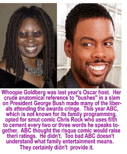 of those idols who would soon be feted for the movies they make. Every year the television networks create one or two more new award shows. Pretty soon we'll have at least one award show each month, 12 months of the year. How much is enough? The Emmys, the Grammys, The Tonys, the Golden Globes, the Foreign Press Awards, the Sundance Awards, the People's Choice Awards and the Oscars. I think we leapfrogged "enough" and went directly to "too many." Every year the ratings on all of them drop as fewer and fewer Americans tune in. While award shows are the basest form of reality programing, and while reality TV shows are generally hot, award shows are not. People are almost as tired of the "award goes to" rhetoric as they are the Bush-bashing, antiwar, anti-Christian, anti-white middle class hate speech that is now standard fare for most of the presenters and recipients. It's too bad that the TV networks didn't get the word that the Democrats got on Nov. 2, 2004 they're out of step with America.