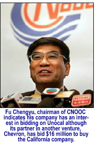 for a piece of this anticipated action. In the event CNOOC moves fast enoughand with enough money to outbid Chevron (which has Rockefeller money at its disposal)the consumers in California need to boycott Unocal from the moment the transnational deal is finalized since what is owned by the Chinese government is, in reality, owned by the People's Liberation Army of the People's Republic of China. That means everytime Californians buy a gallon of gasoline at a CNOOC-Unocal station (providing CNOOC ends up with the company) they will be paying for a new clip of ammo for a Chinese AK47 that, some day in the not too distant future, will be firing at American troops_or American citizens. If CNOOC ends up with UNOCAL, consumers who buy their gas at Walmartthinking it's the one thing you can still buy at the chain Sam Walton built that doesn't come from Chinaneed to ask themselves again just how many of their hard-earned dollars they want to send to the People's Liberation Army. Once again, you have my two cents worth on this subject.