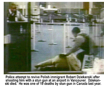 with a stun gun in the hands of the RCMP. Police agencies in the United States and elsewhere have somehow missed the purpose of the stun gun. When the weapon was designed by Taser International, it was designed as an alternative to deadly force in restraining violent suspects. Increasingly today it is used by police as a "gender equalizer." Lightweight female officers who should never have been put on the force let alone be assigned as street cops are armed with stun guns with the right to use them on any male suspect who even remotely resists them. Disabling suspectseven those who simply do not respond fast enough to orders to disperse, or disruptive elderly people whose only crime is being mentally disoriented and unresponsiveis increasingly being done with stun guns because it's more convenient and, as Cpl. Wilson in Kanloops said, "...we've got more important work to do on the street..." Counting Dziekanski, there have been 19 stun gun-related deaths in Canada since 2001. In an analysis of 563 stun gun incidents investigated by the Canadian media from 2002 to 2005, three-fourths of the suspects were unarmed, defeating the original intent of the weaponusing nonlethal force to subdue violent suspects. The Canadian media is alarmed by the increased use of this deadly weapon by Canadian law enforcement officers on unarmed, merely unruly citizensmany of whom's only crime is being intoxicated. Media reports in the United States indicated that 180 people died in stun gun-related deaths in 2006. The Canadian House of Commons Public Safety Committee is examining the growing use of stun guns. It plans to hear testimony from RCMP officers, customs officials and other affected people before drafting a report to Parliament. The RCMP argued that the use of stun guns saved 4,000 lives since police started using them. The spokesman for the RCMP, Troy Lightfoot, said the use of stun guns is appropriate, and enhances public safety. "And," he said, "it is one of the least injurious means that we have available to take people into police custody." With respect to transparency, Lightfoot refused to comment why the RCMP is not providing the reports mandated by law. Other police officials maintain that the information is provided by the officers, but that the information is censored to protect the privacy of the people who had encounters with police. The long and short of it is that stun guns are potentially lethal weapons that are used by police officers to subdue nonviolent offenders and, in many cases, elderly people whose immune systems are compromised. Police officers who use stun guns on unarmed, nonbelligerent offenders who are stunned because they don't respond fast enough should be charged with assault, or fired. In the event that nonviolent, unarmed offenders die after being shot with a stun gun, the police officer must be charged with negligent homicide caused by unnecessary force. Once again, you have my two cents worth on this issue.