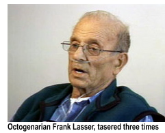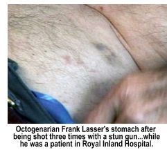 uses stun gun on 82-year old heart patient in An 82-year old Kamloops, British Columbia bypass recipient was rushed to Royal Inland Hospital on March 22, 2008 with emphysema aggravated by pneumonia. The patient, former prison guard Frank Lesser, suffered from a form of dementia triggered by his breathing difficulties. Lasser's breathing disorder required him to carry a portable oxygen tank at all times. Lasser entered the hospital as an inpatient through the emergency room. He was assigned a bed and an "air-conditioned" hospital gown.