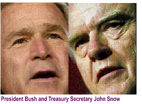 Then, with what had to be a tongue-in-cheek comment, Snow said Bush won't abandon his low tax policies, claiming the new tax code would deprive the Treasury of "billions of dollars" a year (on capital gains taxes and taxes on stock dividends).To achieve deficit reduction and lower taxes, Snow added, reforming the US Tax Code was a priority for the Bush Administration. Snow's plan to "reform" the US Tax Code will cost every low and middle class family in America at least 50% more in taxes at the onset. And under the next liberal's presidency orGod forbidif the liberals regain control of the purse strings of America in 2006 or 2008, the middle class American taxpayer will once again be chained to the ox cart of tax servitude to the impoverished as the welfare state is reborn in America. The middle class will have no escape from the taxload since none of the expenses that the taxpayer had previously been able to use to reduce their tax liability will be eligible under the plans advanced by the President's Advisory Panel on Federal Tax Reform. Once again, for what its worth, you have my two cents worth.