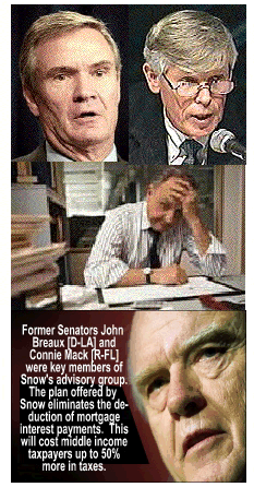The new tax plan developed by the presidential advisory panelTreasury Secretary Snow claimswill lower the tax rates and reduce paperwork for all taxpayers. Not true. It will reduce paperwork on in the sense that Snow's proposal comes about as close as any to the two line tax form you see in every tax joke: [1] How much did you earn? [2] Send it. In reality, while those with incomes over $150,000 will receive genuine tax breaks, the true middle class ($65,000 to $150,000) that carries the brunt of the taxload will take a tremendous beating since both of the plans proposed by Snow's group scales back or eliminates every deduction you made this year. The deductions for home mortgage interest and the deduction for the premiums you pay for employer-provided health care will vanish under the smoke and mirrors of Washington, DC tax magicians who want you to believe you are getting something you're not.