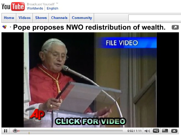 In the third encyclical of his pontificate, Pope Benedict XVI called for the establishment of a new world financial order, denouncing the "profit at all cost" mentality of the globalized economy. The pope said that greed has brought about the worst economic downturn since the Great Depression. Benedict released the encylical just days before the G-8 met in the tiny town of L'Aquila in central Italy. The Director of the Vatican Press Office, Fr. Federico Lombardi, noted that "...in the world today, the Market sets its own rules and regulations, and we have seen the disaster from this over the last year." The pope said he is not opposed to a globalized economy because, if done correctly, it adds unprecedented potential to redistribute wealth around the world. Get your camcorders and video phones ready. Revelation 18 appears to be just around the corner.