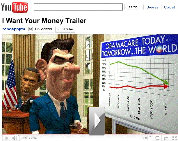 "We have to pass the [healthcare] bill so, eh, we can find out what is in it." This is the terrifying statement that was made by House Speaker Nancy Pelosi on the eve of passing Obamacare in the Housebecause she was not kidding. No elected member of Congress wrote the bill. And none were given a chance to read it. And, frankly, none wanted to read it because they feared if they did they could not, in good conscience, vote for it. Credit is given on page 158 of the Patient Protection and Affordable Care Act to the senior staffers on the Hill who helped the lobbyists for the princes of industry and the barons of banking and business write the bill. On page 158 they were exempted, by law, from having to be covered by Obamacare. You gotta ask yourself just what's so bad in that legislation that senior staffers, who are not Congressmen or Senators and are, thus, not exempt from the legislative misdeeds they help create, would demand a provision be added to the bill that specifically exempted them from having to be covered by it? Have we become as placid and complacent as the Jews who sat in the Nazi death camps of Auschwitz waiting for a chemical shower and a quick drying off in a hot furnace? In the "trailer" (above) the cartoon Obama notes that he "...learned in school that spreading the wealth is good for everyone." The cartoon Reagan counters that he learned "..from real life that it's not. In fact, there's a word for it. It's called theft!" Most Americans don't realize where the $787 billion in "stimulus spending" went. Except, of course, they know it didn't go where the politicians promised it was going. It was supposed to jumpstart the economy, get the foreclosed mortgages off the books of commercial bank to free up their ability, under Fed rules, to begin lending money to consumers again and, of course, to save failing banks. The Bush-43 stimulus ($600 billion) which was supposed to loosen credit but didn't because Bush's Treasury Secretary, Henry Paulson, didn't. That money was funneled to Fannie Mae and Freddie Mac to keep them from going bankrupt from guaranteeing loans to home buyers whose only source of income was welfare. And, as a result, consumer lending pretty much dried up, setting the stage for an Obama win in Nov. 2008 from stolen votes surrpetitiously cast by Obama surrogates. About 35 million of them. That brought on the Obama stimulus which was actually the start of a global redistribution of wealth designed specifically to impoverish America and the other industrialized nation as everything denoting affluence is transferred to the emerging nation in a complete reversal of fortunes in the world. Obama campaigned on a promise of change. He had to save the banks in order to jumpstart the economy. Only, he forgot to tell his minority constitutents that the banks he was going to save and the economy he was going to jumpstart were not in the United States. They were in the emerging nations where US banks had loaned too many uncollateralized dollars to third world banks. Had those banks failed, its likely the domino affect would have brought down every central bank in the world and collapsed all of the world's economies, bringing about economic Armageddon. Reagan, who actually did say social progressive spending was theft, was right. It is theft because the Constitution specifically states what Congress can spend tax dollars on. Congress, using sleight of hand, construed the explanatory preamble to the Constitution to be enumerated rights that granted to the federal government the authority to spend money to safeguard everyone's welfare and to promote commerceand/or to control how it was done and what people could or could not do. And every Congressman and Senator who voted in the blind to enact these spending bills not only needs to be thrown out of office, they need to be thrown into prison. And so do the robber barons who bought their souls.